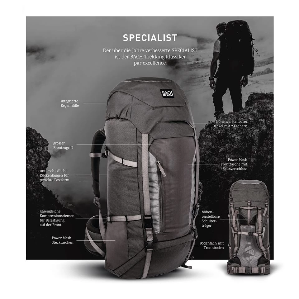 Le Specialist 75 de la marque suisse Bach, est un sac à dos destiné au trekking, aux voyages et aux expéditions. Il est robuste, prévu pour être utilisé dans des conditions difficiles. Les pièces, comme les clips de ceintures, ont été testées jusqu’à -40°C. Ce sac à dos reste confortable jusqu’à une charge de 35 kg, mais il est capable de supporter des charges beaucoup plus importantes. Sa robustesse et son confort de portage pour des charges importante sont ses deux atouts principaux.