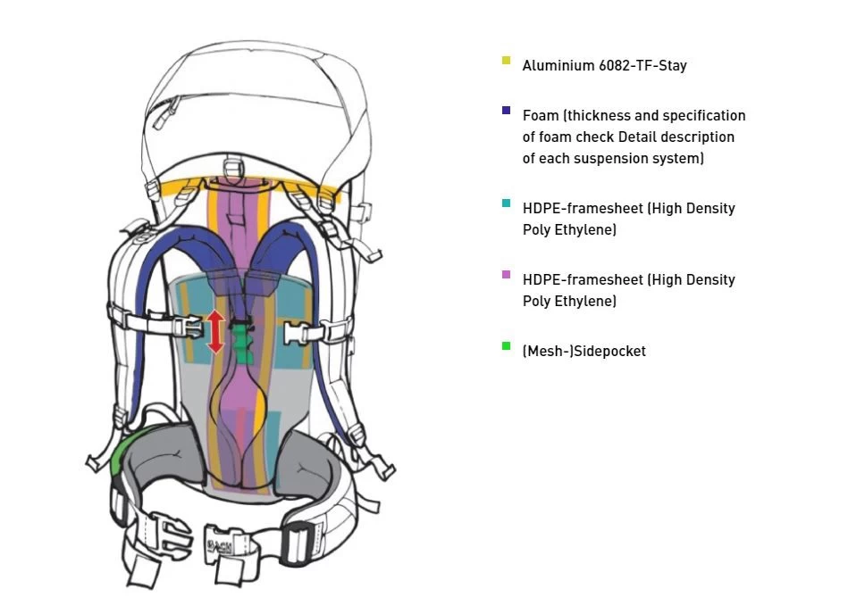 L’armature dorsale du Specialist 75 est composée du système de suspension Expedition de Bach, qui offre un très grand confort de portage. Le dos est composé d’un filet tendu et d’une mousse à pores ouverts qui apportent une bonne ventilation et confort optimum, ainsi qu’une plaque dorsale en HDPE (polyéthylène haute densité). Deux rails courbés en aluminium, placés sur toute la hauteur du sac à dos, assurent un maintien de l’ensemble. La hauteur du dos est réglable afin de s’adapter à chacun. La ceinture est composée de plusieurs couches de mousses EVA, d’une mousse PU à pores ouverts et elle est rigidifiée avec un panneau en HDPE.
