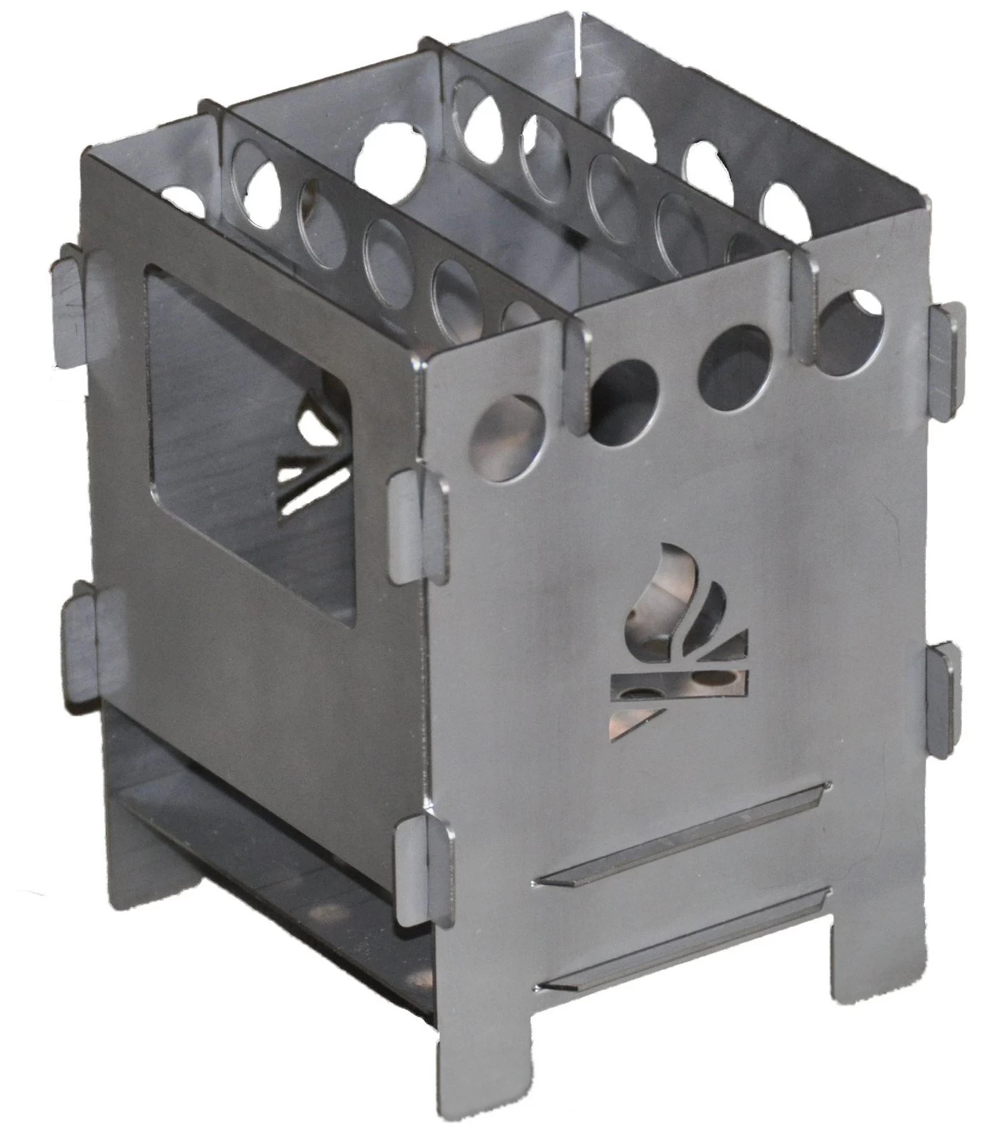 Le Bushbox intègre 2 supports de casseroles et une plaque évitant que les cendres tombent sur le sol. La recharge en bois se fait par une encoche située sur un côté du réchaud.