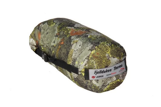 Le Jervenbag comprend 3 zips de fermeture et 2 zips latéraux pour sortir les bras. Aux extrémités des œillets permettent de suspendre le Fjellduken. Il est livré avec des manchons de protection pour les bras et un drapeau orange pour se signaler dans les situations d’urgence.