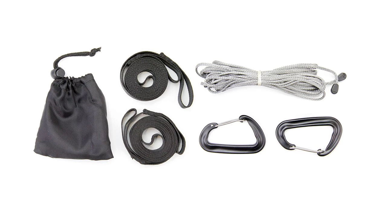 Les lignes Dyneema sont attachées à des mousquetons et à des sangles de type « ceinture de sécurité » de voiture en polyester qui s’enroulent autour d’un arbre. Ces sangles sont fiables et solides pour suspendre votre hamac et n’endommagent pas l’écorce des arbres.
