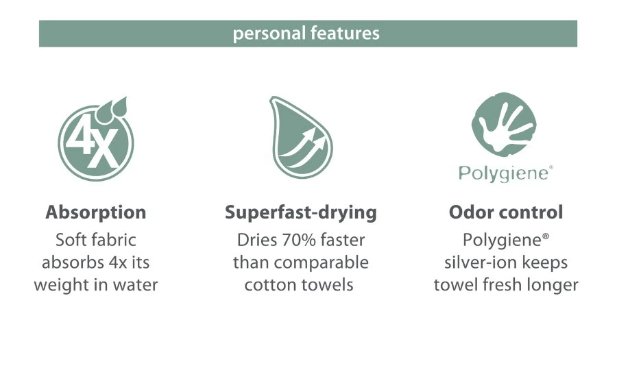 La serviette Personal de PackTowl est constituée en microfibre. Absorbante, à séchage rapide, elle est parfaite pour toutes activités, pour du camping, en voyage, en randonnée… La serviette Personal garde sa fraicheur plus longtemps grâce au traitement de contrôle des odeurs Polygiene.