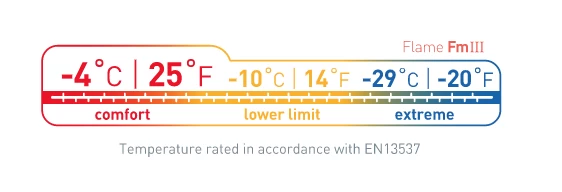 Confort : le Flame FmIII est garni de 440 g (taille Regular) de duvet d’oie européen 850 cuin, répartition 90/10, ce qui correspond à une température confort de -4°C (selon la norme européenne EN13537). L’enveloppe intérieure en nylon 7 deniers et extérieure en nylon léger 10 deniers est agréable au touché.