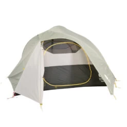 La chambre est autoportante et le double-toit vient se poser dessus. La tente dispose de 2 entrées et 2 absides. Une des entrées possède une fermeture au milieu et l’autre s’ouvre entièrement grâce à sa fermeture en L inversé. Vous pourrez stocker le matériel encombrant ou sale sous les auvents.