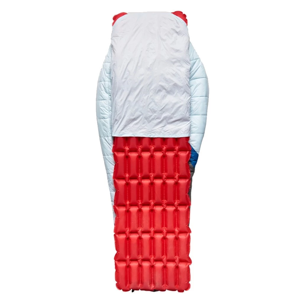 Le fourreau en tissu situé dans le dos permet d’insérer un matelas. Ce dispositif évite de glisser sur le sol pendant la nuit. Sur cette partie centrale du dos, le sac de couchage ne contient pas d’isolation, afin d’économiser sur le poids final. C’est le matelas qui assure l’isolation pour bloquer le froid qui remonte du sol. Au niveau des pieds, une ouverture permet une ventilation par le bas lors des nuitées les plus chaudes.